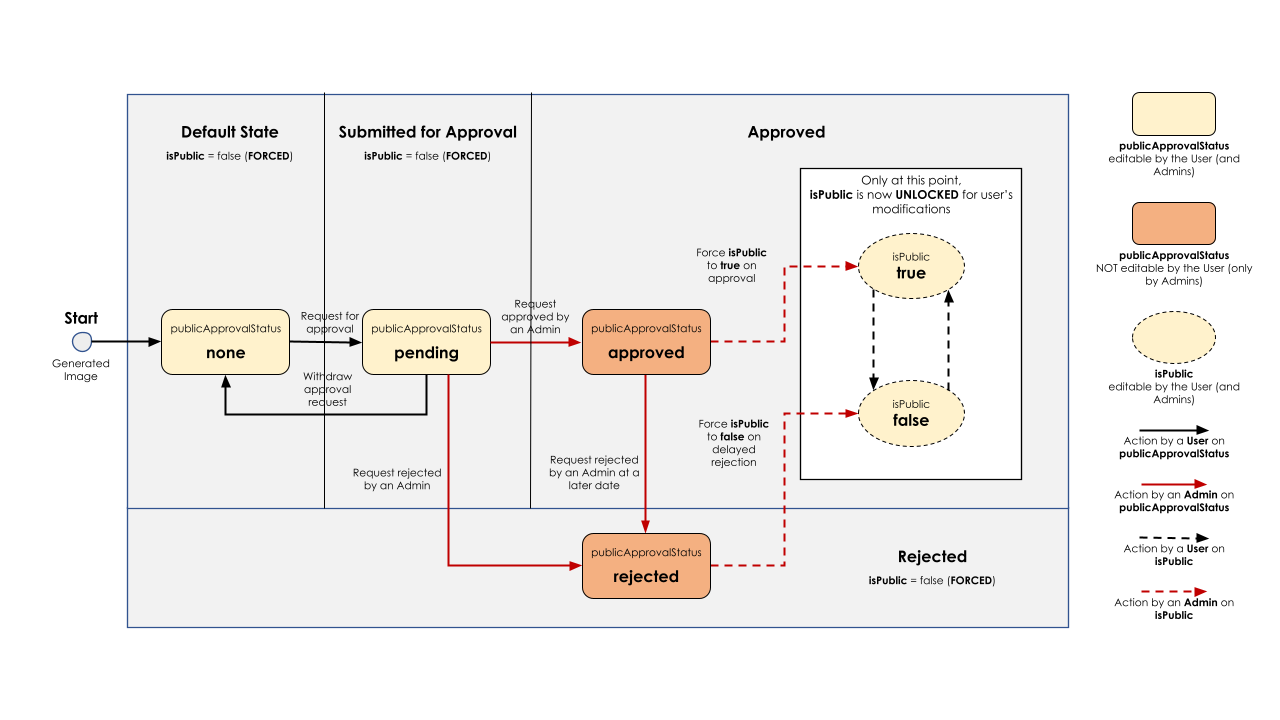 Both approved and rejected states are final, and irreversible by the User. At any time afterward, if the User tries to set publicApprovalStatus to any other value using the setItemProperties endpoint, it will fail.